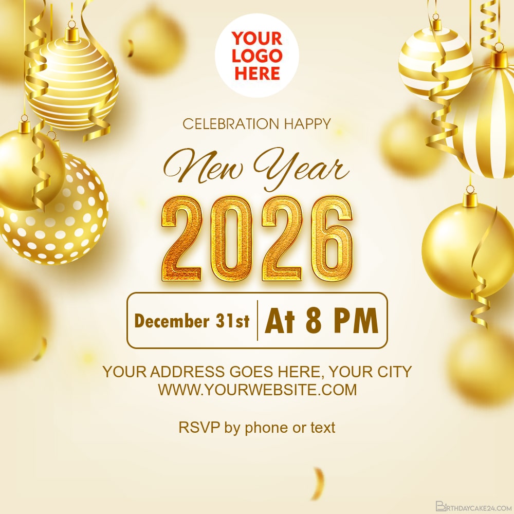 Create custom 2026 New Year invitation cards with golden background and luxury glitter gold balls for friends, relatives, groups. Customize the 2026 New Year invitation card with a custom logo (optional) or you can write the time and place of the party on the card completely free. There's no better way to have the best time of the year than with your friends and all the special people you consider important in your life. Connect and invite people to your New Year's party with this design.