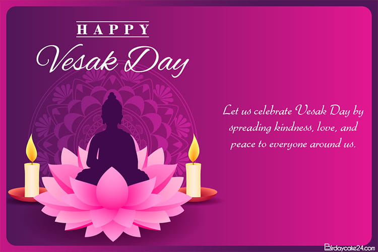 A Happy Vesak Day card design in luxurious purple and pink tones, featuring the Buddha seated on a blooming lotus, combined with warm candlelight and delicate patterns to create a serene and sacred atmosphere for Vesak. This card is perfect for sending greetings to family, friends, and colleagues, or for sharing on social media to spread positive energy and peace during the Vesak celebration.
