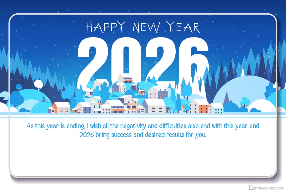 Beautiful and unique New Year 2026 greeting card with a winter landscape design, snowy village, and the highlighted number 2026. The Happy New Year 2026 card carries the meaning of wishing good luck, success, overcoming difficulties, and welcoming a joyful new year. The sharp and modern design of the 2026 greeting card makes it suitable for e-cards, social media sharing, or printing. This is the perfect choice to spread good wishes and start a hopeful new year.