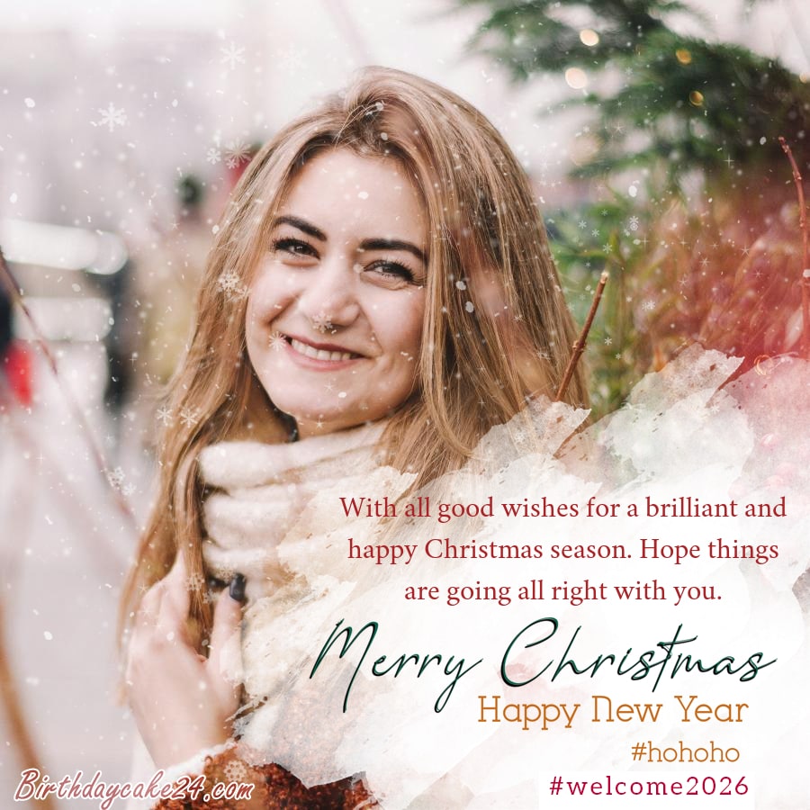 Create the most beautiful Merry Christmas and Happy New Year 2026 photo frame greeting wishes card. Celebrate with Christmas and New Year 2026 frame wishes with pretty little snowflakes, add wishes on this christmas photo card to fill your photos with Christmas atmosphere. Xmas photo frames provide an aesthetic means of displaying images and bring the Christmas and New Year atmosphere closer to you and your family and friends.