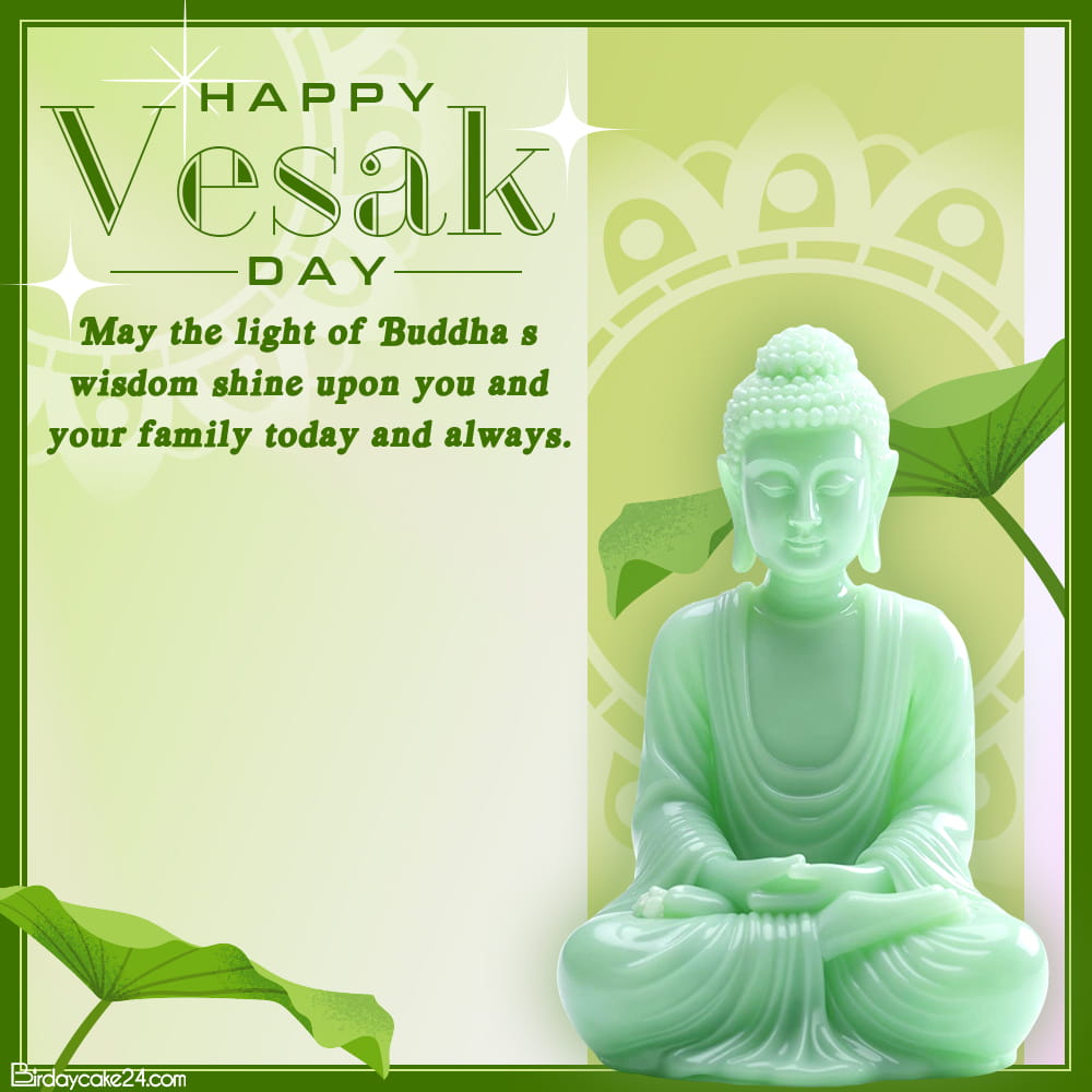 A Happy Vesak Day card design in calming green tones, featuring a meditating Buddha, delicate patterns, and gentle lotus leaves, evoking a sense of peace and solemnity. This design is perfect for sending Vesak greetings to family, friends, or the Buddhist community.